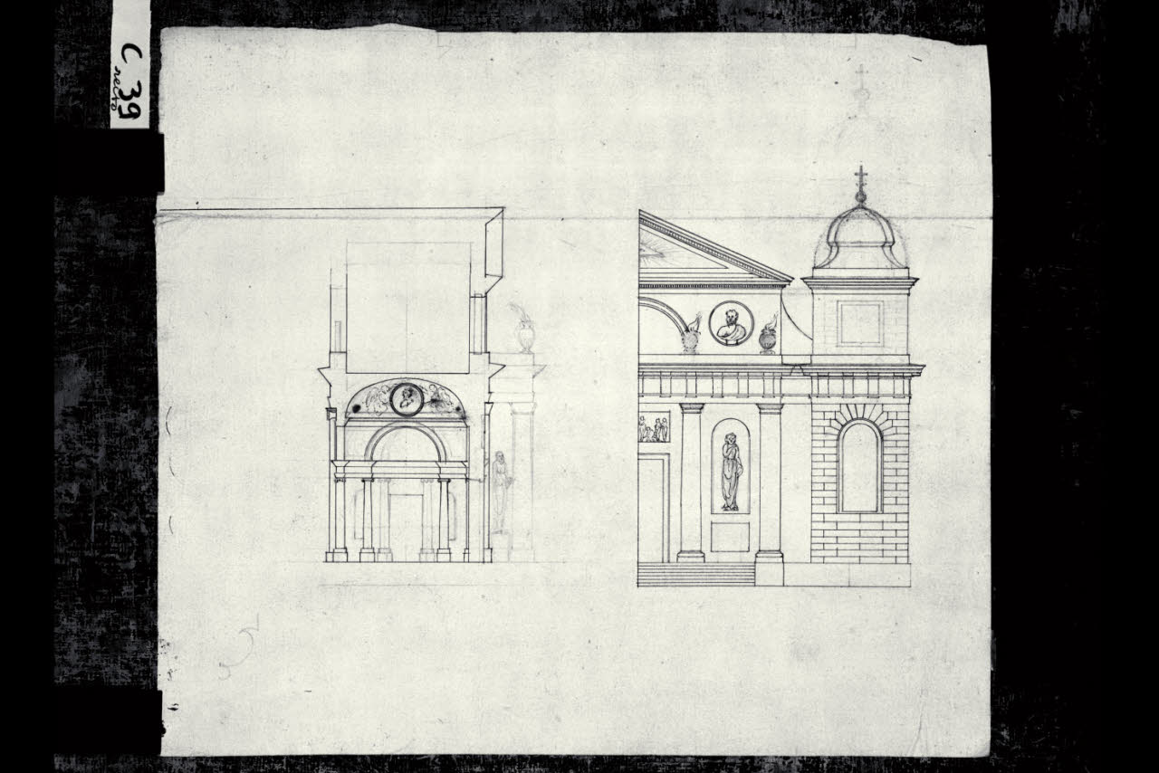 Prospetto e sezione trasversale della prima campata di una chiesa con pronao dorico e torri laterali. Prospetto e sezione trasversale della prima campata di una chiesa con pronao dorico e torri laterali