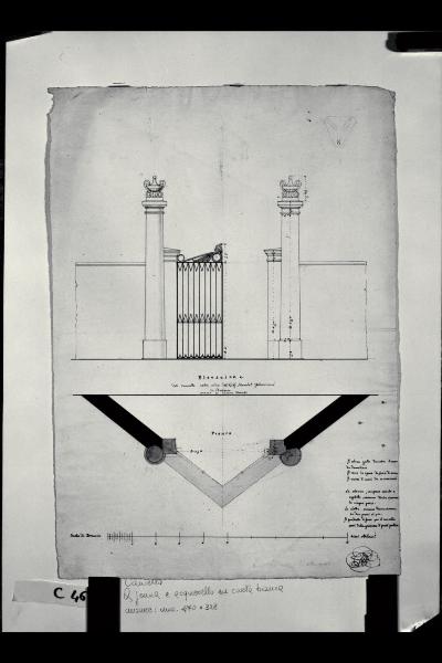Pianta e prospetto del cancello di Villa Pallavicini a Robecco. Pianta e prospetto del cancello di Villa Pallavicini a Robecco