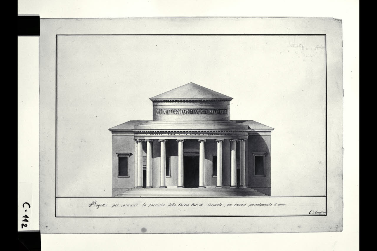 Prospetto della chiesa di S. Giorgio a Cornate d'Adda con pianta parziale della fronte. Prospetto della chiesa di S. Giorgio a Cornate d'Adda con pianta parziale della fronte
