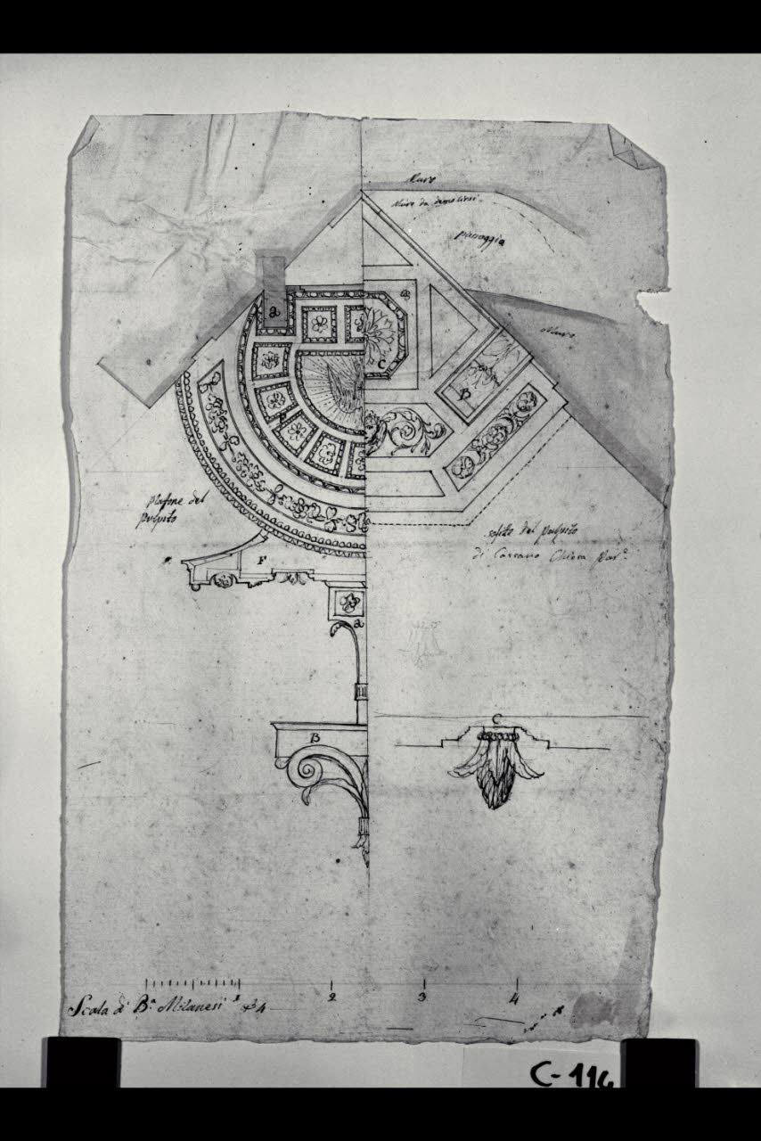 Proiezione in pianta e sezione della decorazione del soffitto del pulpito della chiesa della Beata Vergine Immacolata e di S. Zeno a Cassano d'Adda. Proiezione in pianta e sezione della decorazione del soffitto del pulpito della chiesa della Beata Vergine Immacolata e di S. Zeno a Cassano d'Adda