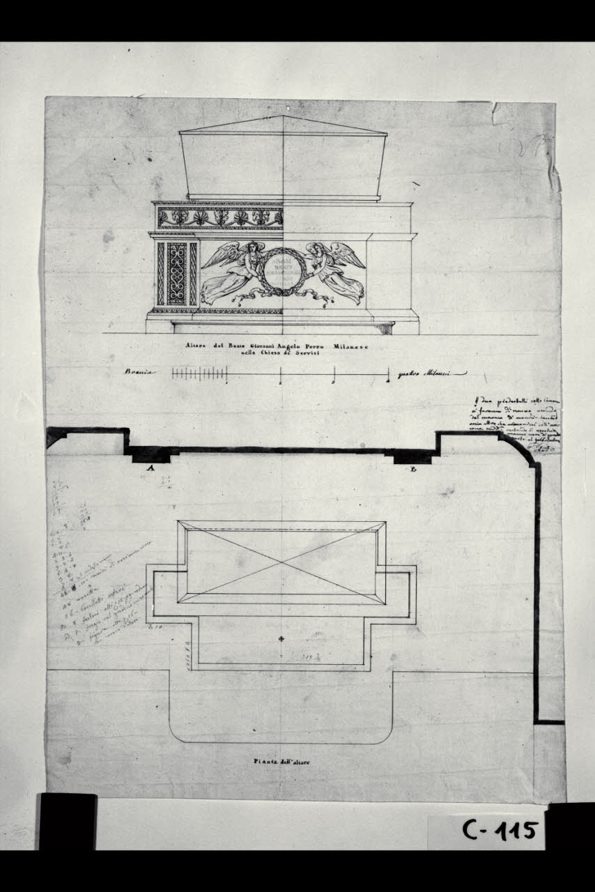 Pianta e prospetto dell'altare del Beato Giovanni Angelo Porro nella chiesa di S. Maria de' Servi a Milano. Pianta e prospetto dell'altare del Beato Giovanni Angelo Porro nella chiesa di S. Maria de' Servi a Milano
