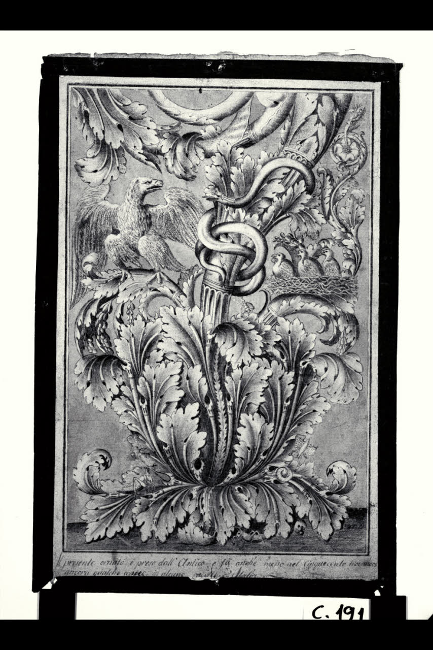 Ornato con foglie d'acanto, volute e uccelli. Ornato con foglie d'acanto, volute e uccelli