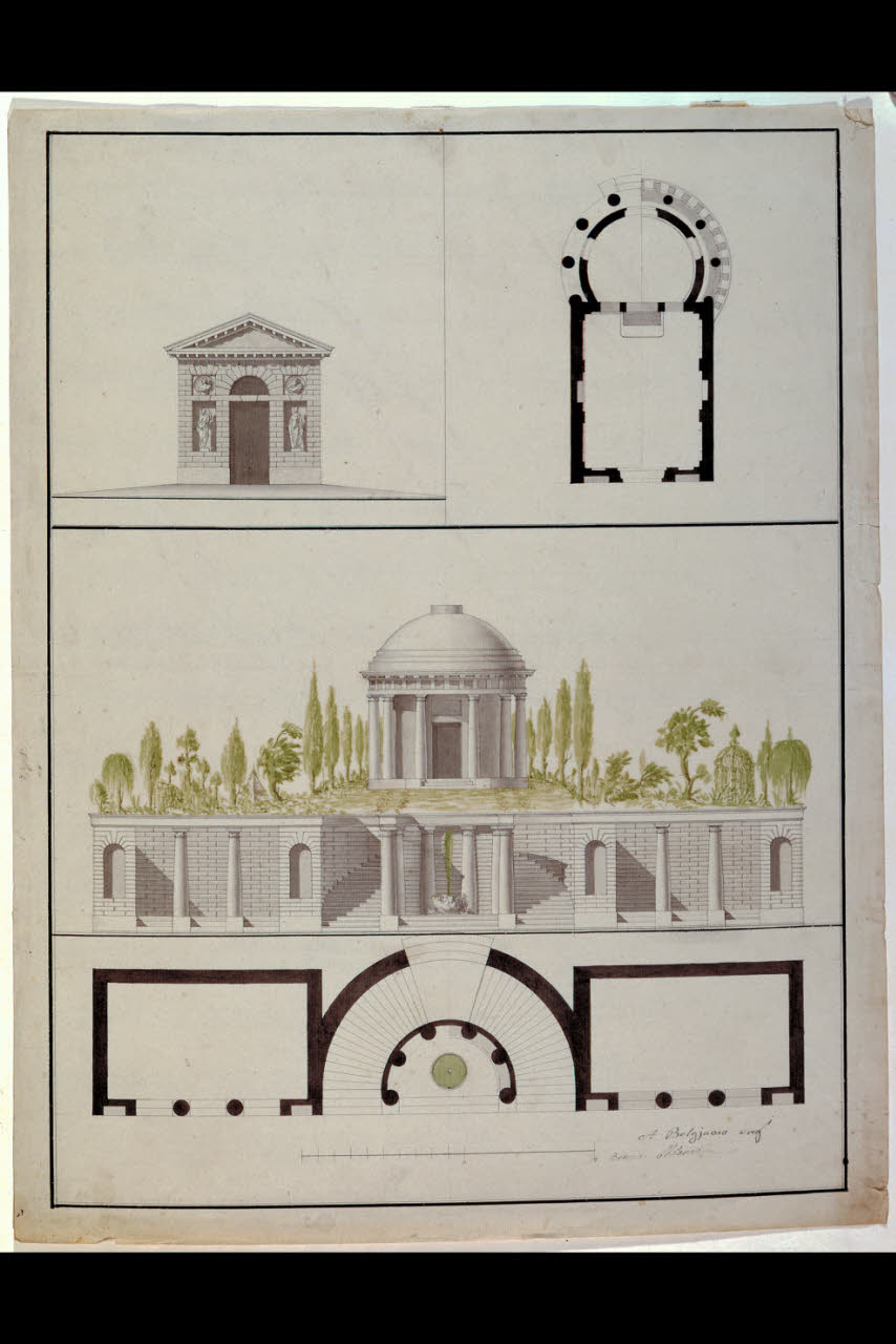 Piante e prospetto di una cappella nel sepolcreto del giardino di Belgioioso