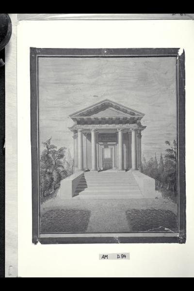 Veduta prospettica della fronte di un padiglione per giardino in forma di tempio con scalea, pronao e cupola. Veduta prospettica della fronte di un padiglione per giardino in forma di tempio con scalea, pronao e cupola