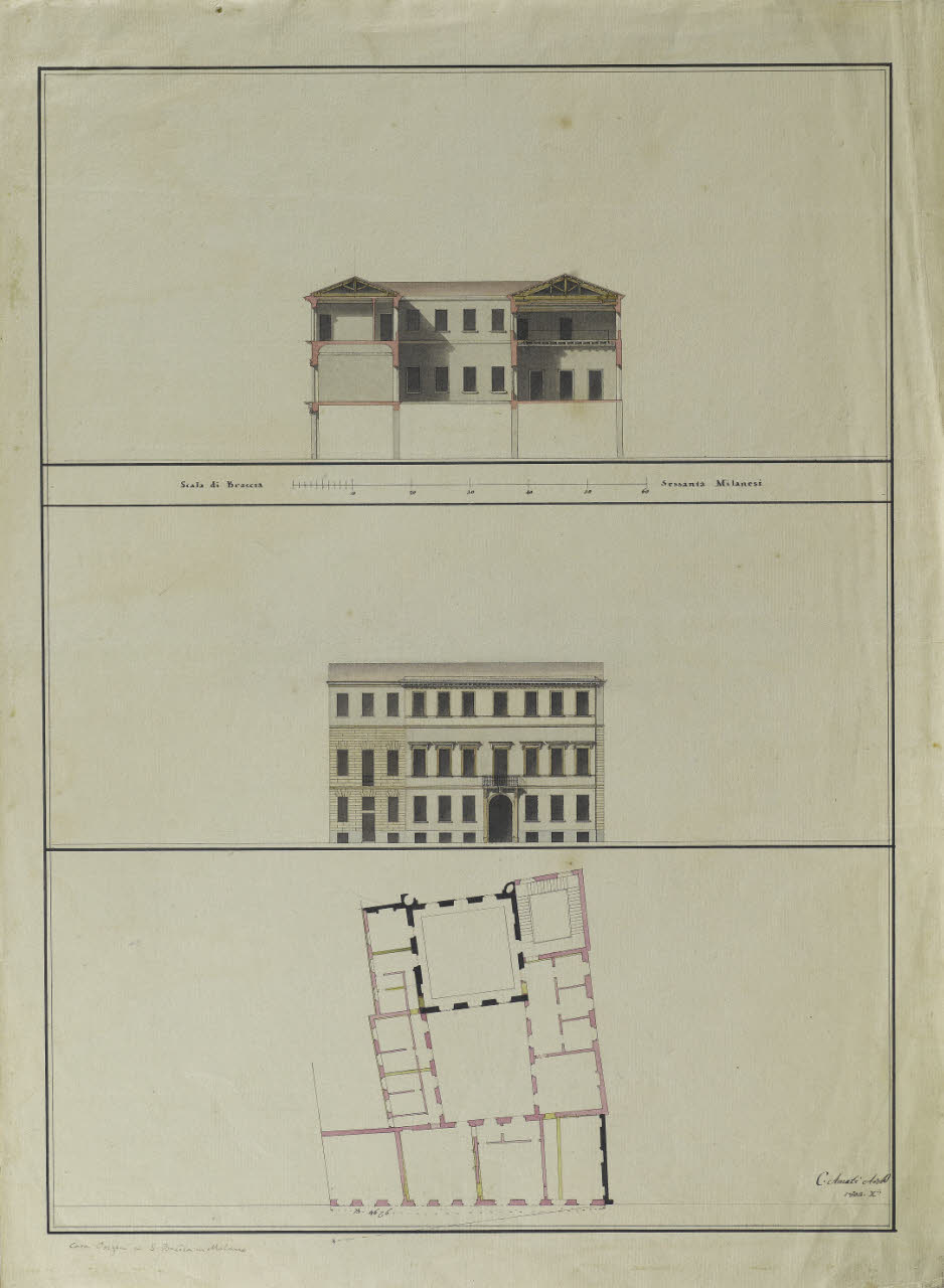Pianta, prospetto e sezione trasversale di Palazzo Arrigoni a Milano (già Contrada S. Romano 403). Pianta, prospetto e sezione trasversale di Palazzo Arrigoni a Milano (già Contrada S. Romano 403)