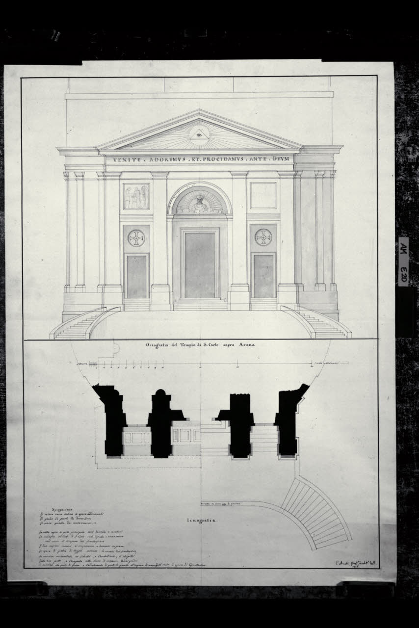 Pianta e prospetto della fronte del Tempio di S. Carlo sopra Arona. Pianta e prospetto della fronte del Tempio di S. Carlo sopra Arona