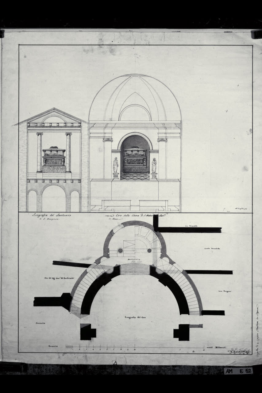 Pianta, prospetto e sezione del coro e della cappella di S. Prospero nella chiesa di S. Pietro Martire a Monza. Pianta, prospetto e sezione del coro e della cappella di S. Prospero nella chiesa di S. Pietro Martire a Monza
