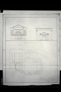Pianta, prospetto e sezione trasversale della chiesa di S. Stefano a Capriano Brianza e zona limitrofa. Pianta, prospetto e sezione trasversale della chiesa di S. Stefano a Capriano Brianza e zona limitrofa