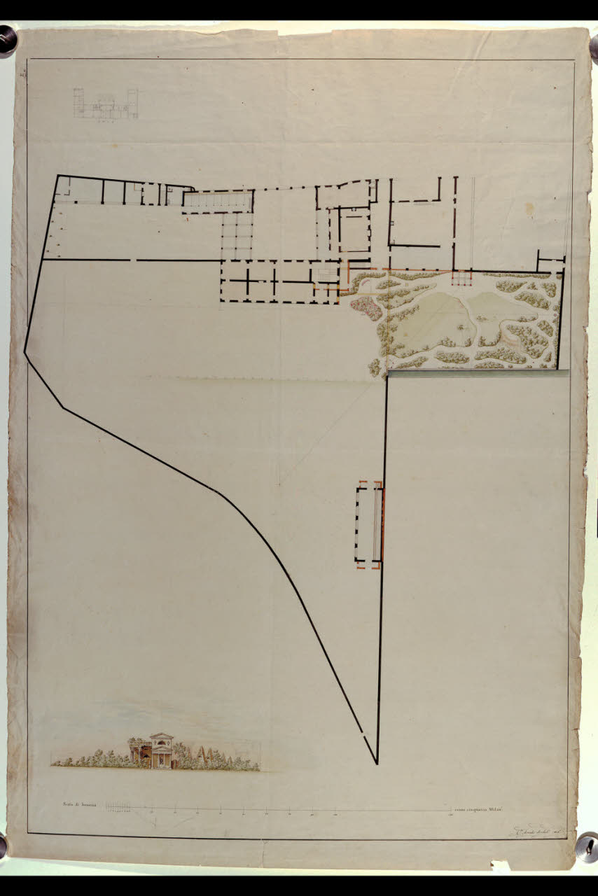 Pianta della Villa Archinto (Pennati) a Monza e prospetto del tempietto del giardino. Pianta della Villa Archinto (Pennati) a Monza e prospetto del tempietto del giardino