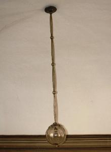 Lampadario costituito da una sfera portalampada sostenuta da un lungo braccio ricoperto da tre elementi di vetro leggermente bombati e raccordati, l'uno all'altro, da delle sfere.