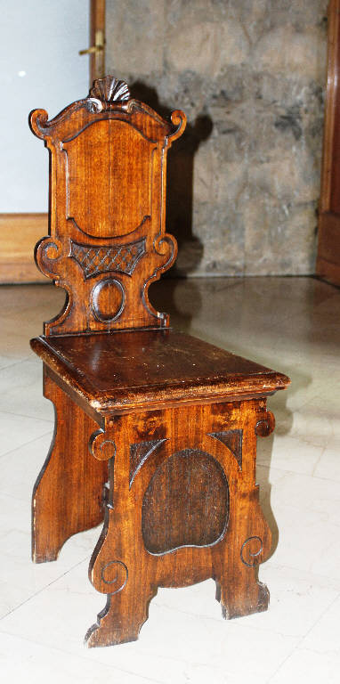 Sedia di gusto rinascimentale caratterizzata da schienale con profilo mistilineo e decorato, lungo i bordi, da volute e da una conchiglia posizionata nel centro del poggia schiena, nella parte centrale da specchiature tonde e mistilinee. Una tavola di forma e decoro analoghi raccorda la seduta ai piedi della sedia.