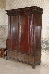 Armadio ad anta doppia con piedi a zampa di leone, base con cassetto la cui fronte è definita da una specchiatura con profilo modanato e decorato a rilievo. Il cassetto è affiancato da due dadi con la superficie scanalata. Il corpo superiore dell'armadio è caratterizzato da due sottili lesene scanalate con capitelli leggermente rilevati, che affiancano i battenti decorati da una cornice modanata e rilevata. L'armadio si conclude con una alta cornice architravata decorata a rievo con motivi floreali stilizzati, ovuli e dentelli.
