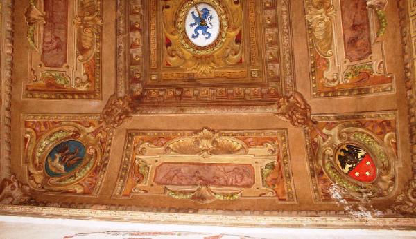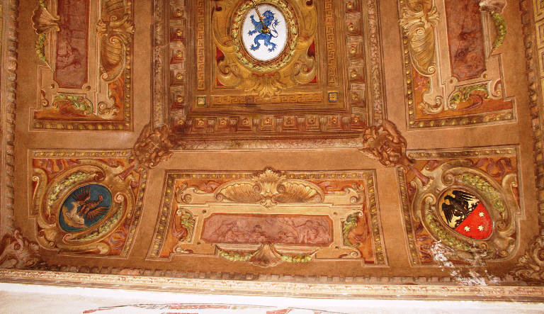 La decorazione pittorica si estende sull'intera volta della sala e prevede quadarature architettoniche entro le quali sono collocati scudi con stemmi e cartelle con scene figurate.
