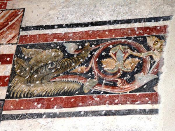 - NOTIZIE STORICO CRITICHE La decorazione pittorica che interessa la parete settentrionale, quella occidentale e quella meridionale della Sala degli Affreschi è venuta alla luce tra marzo 2001 e luglio 2002 quando, durante i lavori di sostituzione della vecchia tapezzeria che ricopriva le pareti della stanza, vennero trovate tracce di affreschi sempre più estese. Tolta interamente la tappezzeria, le pareti mostrarono ampie superfici dipinte pertineti a due campagne decorative diverse. La prima databile al XIV secolo, la seconda al XVII.