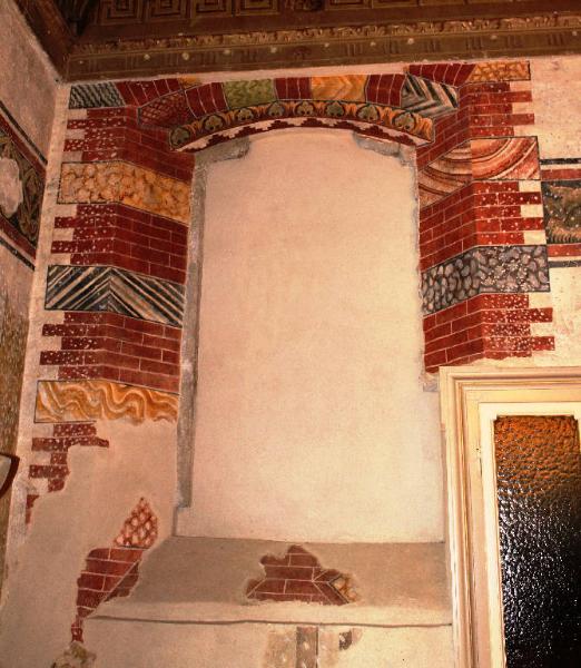 La decorazione pittorica si sviluppa come una mostra di finestra intorno ad una apertura oggi tamponata.
