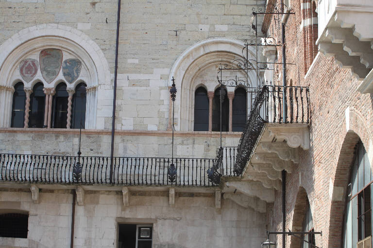 Balconata sostenuta da mensoloni a volute con ringhiera, cancello e pergole in ferro decorate da motivi ornamentali,