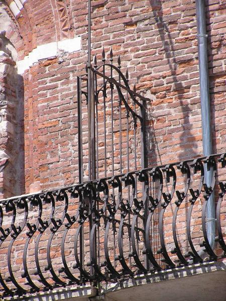 Cancello ad unico battente costituto da lance raccordate da elemento ad ansa e riccioli a volute ai lati.