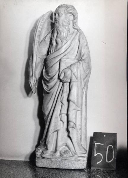 La statuetta raffigura un apostolo martire. Sostiene nella mano dx la palma del martirio, mentre nella sx stringe un libro chiuso ( il vangelo).\nIl santo ha la testa leggermente portata in avanti, reclinata sul lato dx,. La veste lascia scoperti i piedi.\nSul retro non vi è alcuna definizione formale, ma la superficie è quasi piatta e presenta i segni della sbozzatura . Al centro del busto è inserito, in un piccolo alloggiamento, il gancio d'ancoraggio, al quale è ancora fissata la catena con 3 anelli.\nQuest'ultimo è saldato al marmo con piombo; gancio e catena sono in ferro.