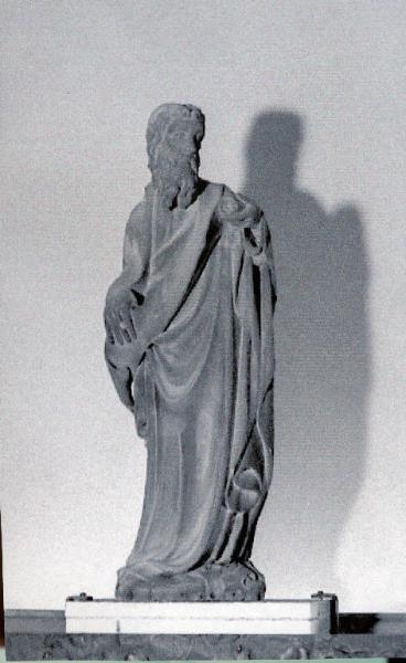 Uomo con capelli e barba lunga. La veste lunga lascia scoperto solamente la punta del piede dx e le mani. Tra le mani sostiene un cartiglio srotolato, La mano sx è posizionata più in alto rispetto alla dx che mostra il dorso, e regge il ricciolo terminale del cartiglio. Il cartiglio è privo di iscrizioni. La testa è ruotata verso sx rispetto al corpo.\nSul retro l'opera si presenta finita, al centro del busto è inserito, in un piccolo alloggiamento, saldato al marmo con piombo, il gancio d'ancoraggio in ferro, a sezione quadrata, al quale manca l'anello terminale.