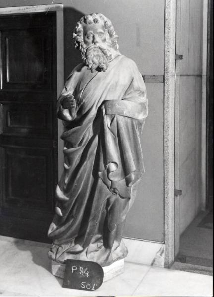 - NOTIZIE STORICO CRITICHE A causa della scarsità di documentazione e della quantità di scalpellini che lavoravano in quegli anni presso il cantiere, risulta pressoché impossibile attribuire l'opera. \nLa Bossaglia l'avvicina all'ambiente francese tramite i confronti con la statuaria della cattedrale di Reims. Nella statuaria delle cattedrali gotiche francesi alcuni stilemi corrispondono. In particolare nella statuaria della cattedrale di Reims si possono trovare analogie somatiche soprattutto per quanto riguarda gli zigomi pronunciati, il naso di piccole dimensioni, e la modalità della resa dei capelli a chiocciola. C'è da considerare però che la statuaria di Reims risale al XIII secolo ed essendo statue colonne non presentano la stessa possenza fisica ne gli stessi panneggi così addolciti nelle estremità. \nRossi invece associa la tipologia di resa della corporatura e della fisiognomica ai peducci di Buda ascrivibili all'ambito parleriano. In effetti gli elementi stilistici e plastici che compongono tale scultura sono molteplici, gli stilemi presenti provengono da diverse maestranze. La modalità per esempio di fattura dei capelli a chiocciola deriva dalle sculture del XIII di Reims, come alcuni tratti somatici. L'influsso delle maestranze di Buda è visibile nella squadratura della testa e nella possenza fisica. La concomitanza di queste caratteristiche non aiuta a definire l'ambito a cui appartenne lo scultore che fece questa statua. Ciò è però spiegabile dalla stretta convivenza di queste maestranze, tedesche e francesi, all'interno del cantiere alla fine del 1300. Questa vicinanza ha fatto si che si potessero "guardare" l'un con l'altro e di conseguenza assorbire i reciproci stilemi. Che risultano sicuramente stemperati dai disegni-modello che, eseguiti da maestranze locali, venivano dati agli scalpellini. Questa scultura dunque si può attribuire ad un ambiente franco-tedesco.\nla statua proviene dal capitello del pilone 84