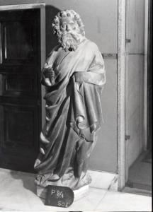 Uomo con capelli riccioluti e barba lunga riccioluta. Sotto al mantello si intravede la veste. Il manto lascia scoperta la punta del piede destro e parzialmente due dita del piede sinistro. Tra le mani tiene un cartiglio srotolato totalmente mancante nella parte centrale. Il volto è leggermente ruotato verso sinistra. Sul retro: vi è un inizio di definizione formale e la superficie e presenta i segni della sbozzatura (subbia), al centro del busto è inserito, in un piccolo alloggiamento, il gancio d'ancoraggio in ferro, saldato al marmo con piombo.