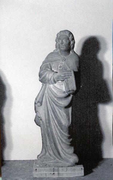 figura maschile di giovane aspetto con capelli lunghi fino alle spalle, ondulati. coperto da unaveste lunga fino ai piedi ed una sopraveste tenuta ferma in petto da una spilla a fiore. tra le mani sostiene in libro chiuso. \nsul retro: pur essendo già definita la soluzione formale, la superficie non è levigata ma presenta i segni della punta e/o \nal centro del busto è inserito, in un piccolo alloggiamento, il gancio d'ancoraggio in ferro saldato al marmo con piombo
