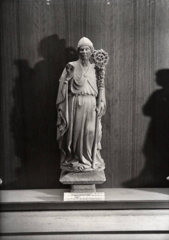 Figura maschile abbigliata da vescovo con mitra e pastorale, guanti , piviale e razionale in atto di benedire.\nsul retro, pur essendo già definita la soluzione formale, la superficie non è levigata ma presenta i segni della punta o della gradina.