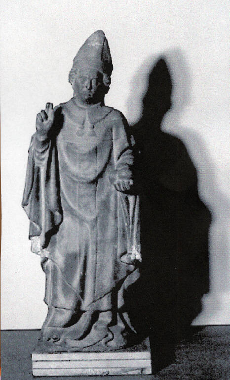 Figura maschile abbiglitata da vescovo, con mitra, piviale e razionale in atto di benedire.nella mano destra sostiene tre sfere, attributo del santo.\nsul retro: pur essendo già definita la soluzione formale, la superficie non è levigata ma presenta i segni dello scalpello e/o della gradina tenuta ad angolo ampio rispetto ad essa (solchi brevi quasi incisioni a punta ma a distanza fissa) \nAl centro del busto è inserito, in un piccolo alloggiamento, saldato al marmo con piombo, il gancio d'ancoraggio in ferro, a sezione quadrata, al quale manca l'anella terminale
