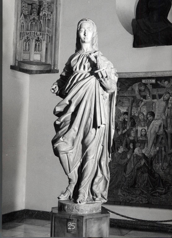 Figura femminile con capelli pettinati in un accurata acconciatura, indossa una lunga veste tenuta da una cintura posizinata sotto al seno. nella mano sinistra porta il suo attributon un agnello. i piedi, lasciati scoperti dalla veste indossano calzari aperti. Sul retro pur essendo già definita la soluzione formale, la superficie non è levigata ma presenta i segni dello scalpello e della gradina tenuta ad angolo ampio (solchi brevi quasi incisioni a punta ma a distanza fissa) e ad angolo acuto (solchi allungati)rispetto ad essa, e nei solchi delle pieghe dei panneggi i segni del trapano.