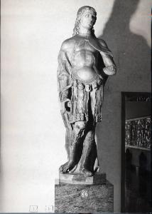 Figura maschile con capelli lunghi con vesti da guerriero. sul retro: La statua non ha alcuna definizione formale, ma è quasi piatta e la superficie presenta i segni della sbozzatura.\nAl centro del busto è inserito, in un piccolo alloggiamento, il gancio d'ancoraggio in ferro saldato al marmo con piombo