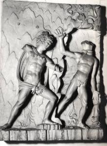 bassorilievo rappresentanti due figure virili stanti. La figura di destra è mutila della testa, la figura di sinistra è mutila di entrambe le braccia, indossa una pelle di leone.