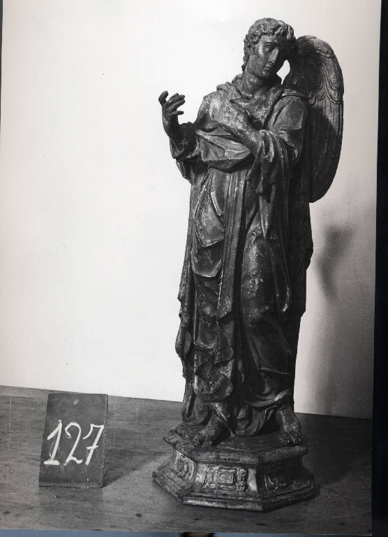 Figura angelica stante, indossa una lunga veste, le mani sorreggevano qualcosa non più presente, la testa è rivolta verso sinistra.\npresenta un basamento in legno, il retro è non lavorato, aperto e riempito di calce? la patinatura prsenta tracce di doratura.