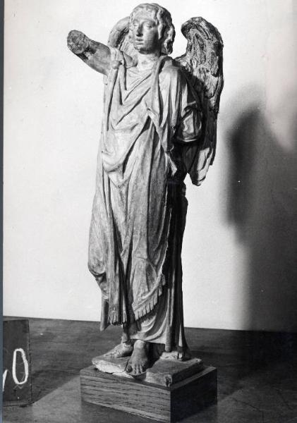 Angelo telamone con lunga veste, il braccio destro è alzato e mutilo. il braccio sinistro è piegato dietro la schiena.