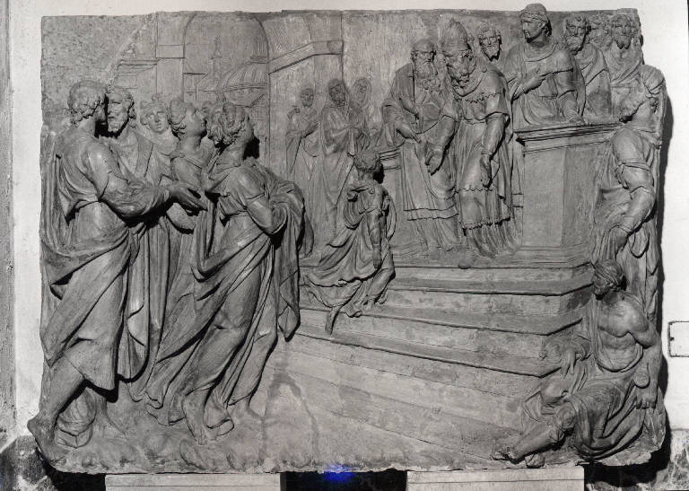 Altorilievo rappresentante la Presentazione della Vergine al tempio, sulla sinistra una coppia di figure maschile stanti che parlano tra di loro insieme a due figure femminili che assistono alla scena. sulla destra del rilievo la scala che sale la piccola vergine in cima alla quale il celebrante l' accoglie con le braccia aperte circodato da astanti.\nsulla destra in primo piano una figura maschile inturbantata seduta.