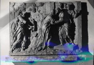 altorilievo rappresentante la Visitazione, l'incontro delle donne è leggermente spostato verso destra rispetto al centro del rilievo, sulla sinistra figura maschile stante con asinello.