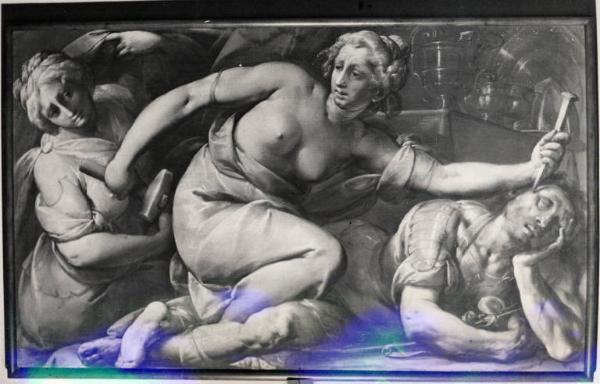 Monocromo rappresentante Sisara e Giale. Sisara è la figura femminile centrale alla scena seminuda nella mano destra sostiene un martello nella mano sinistra un chiodo che appoggia alla tempia di Giaele. Giale è rappresentato da una figura maschile in posizione sdraiata sul lato destro della scena. A sinistra della scena è presente una figura femminile.