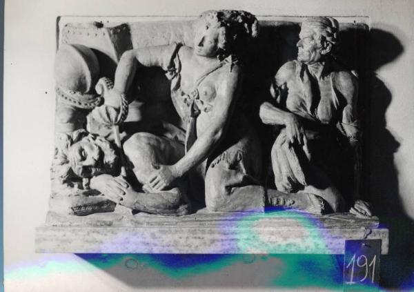 altorilievo in terracotta rappresentante Giuditta e Oloferne. La figura femminile di Giuditta è al centro della scena inginocchiata seminuda intenta a tagliare la testa di Oloferne con una spada impugnata con la mano destra. Oloferne a destra di Giuditta sè una figura maschile in posizione sdraiata. A sinistra di Giuditta è presente una figura femminile anziana.