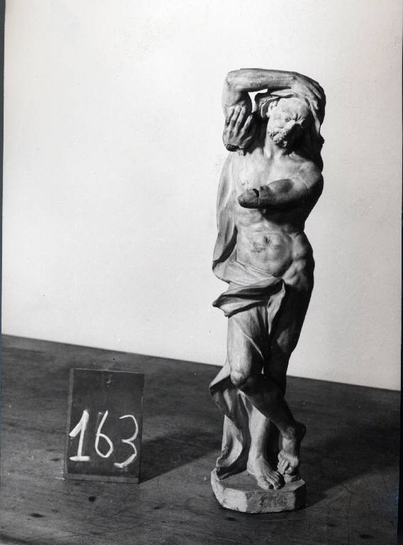 Figura maschile stante barbuta e seminuda, velata. il braccio destro poggia sopra alla testa e il sinistro lo sorregge.