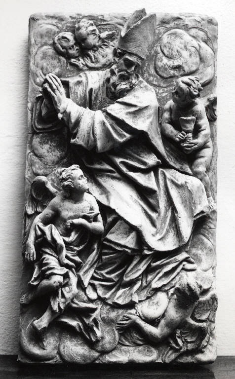 Rilievo rappresentante una figura maschile barbuta abbigliata con vesti vescovili, in atto di preghiera con le mani giunte. intorno a lui nuvole, teste di putti e figure angeliche.