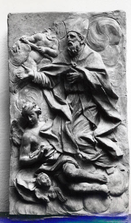Rilievo in terracotta rappresentante una figura maschile barbuta in abiti vescovili, inotrno al lui sono rappresentate nuvole. Ai suoi piedi c'è una figura angelica seminuda e una testa di putto. \nin alto una figura angelica mutila edlla testa.