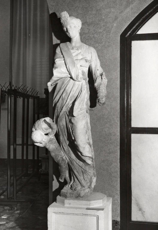 Scultura rappresentante la personificazione della religione in una figura femminile stante coronata abbigliata con vesti linghe ed accompagnata dalla figura di un putto posto al suo fianco destro portante il triregno.