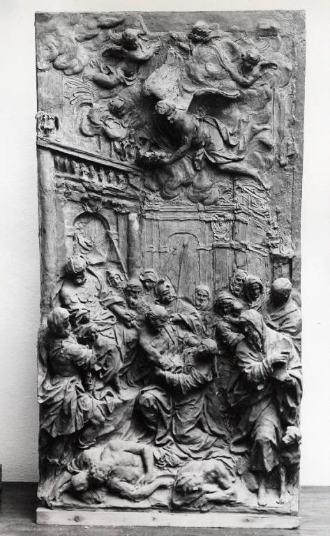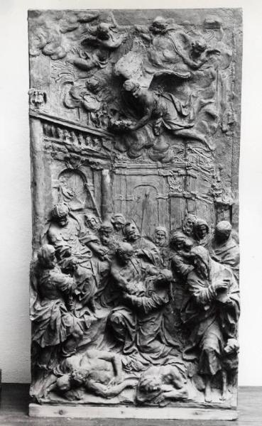 - NOTIZIE STORICO CRITICHE Bozzetto per la pale marmaroea dell'altare di S. Agnese. Le caratteristiche stilistiche sono riferibili a modelli ancora attardati e non il linea con la produzione scultoriea a tutto tondo dell'autore.