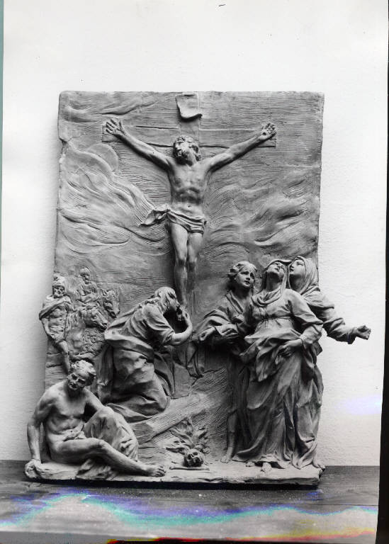 Scena della crocifissione di Cristocircondato da nubi, con la madalena ai piedi, la Vergine svenuta sorretta da S. Giovanni. Un a figuara ignuda quinda la quinta.