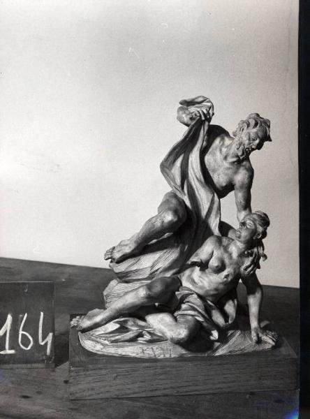 Gruppp di figure. Una figura maschile, si china poggianodo il corpo sul braccio sinistro, sopra un figura femminile sdraiata a terra, in posizione recumbente.