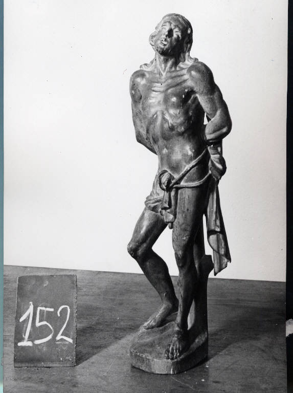 Santo martire legato ad una lbero con le mani dietro la schena il volto sofferente verso l'alto, le ginocchia flesse.