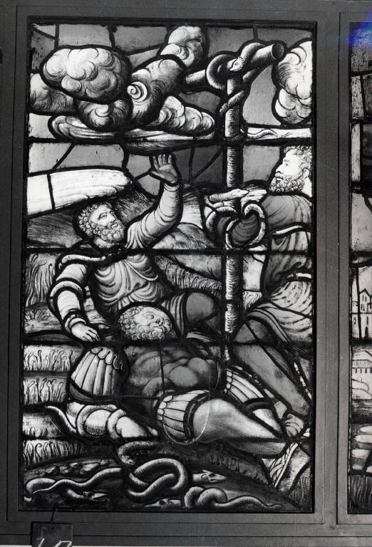 Il pannello rappresenta l'episodio che vede come protagonisti Mosè e il serpente di bronzo.\nAl centro della scena sono rappresentati due uomini, entrambi sdraiati su di un prato; tutti e due indossano delle vesti di color giallo, di cui quello in primo piano porta anche l'armatura e dei sandali. \nIl terzo personaggio, posto all'estrema destra del pannello, indossa un abito rosso che si ferma all'altezza del ginocchio, mentre le gambe sono coperte da dei pantaloni azzurri; infine i piedi sono coperti da calzari rossi.\nTutte e tre i personaggi hanno capigliatura, barba folta e riccioluta. \nNella composizione sono presenti diversi serpenti: un gruppo in basso al pannello, uno attorcigliato sull'avambraccio destro del personaggio con l'armatura, e un altro sempre posto, sul braccio destro di Mosè, un altro ancora attorcigliato sul braccio sinistro e al busto dell'uomo all'estrema destra della formella.\nL'ultimo dei serpenti che è il serpente di bronzo, si trova in cima a un tronco alla cui estremità è posto un legno orizzontale.\nTutta la scena è ambientata in un paesaggio collinare, verde, e rigoglioso; sullo sfondo e nel cielo azzurrissimo possiamo trovare delle nuvole estremamente elaborate con dei motivi curvi e spiraliformi.\nI colori nella formella sono tutti splendenti,