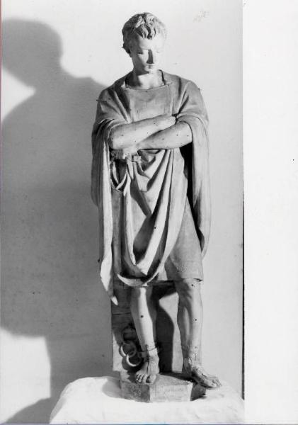 figura virile in ceppi, con tunica corta, braccia conserte e sguardo rivolto in basso.