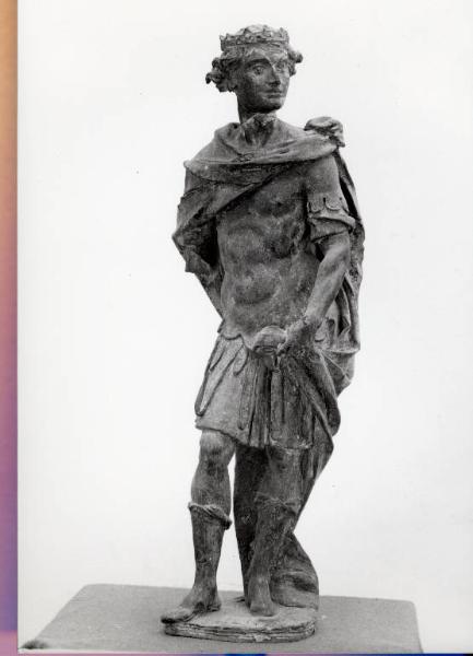 Figura di Guerriero coronoato, con leggera torsione del busto verso sinistra, la mano destra regge un lembo del manto.
