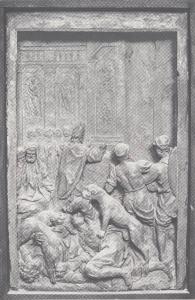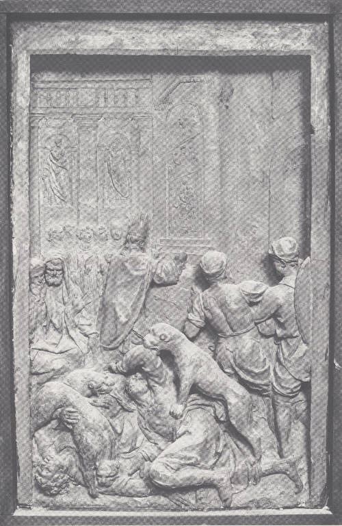 Su sfondo calssicheggiante, una serie di figure sono accasciate a terra colpite da animali (leopardi) due figure stanti sull'esterma destra, un uomo in abiti episcopali al centro della scena in secondo piano.