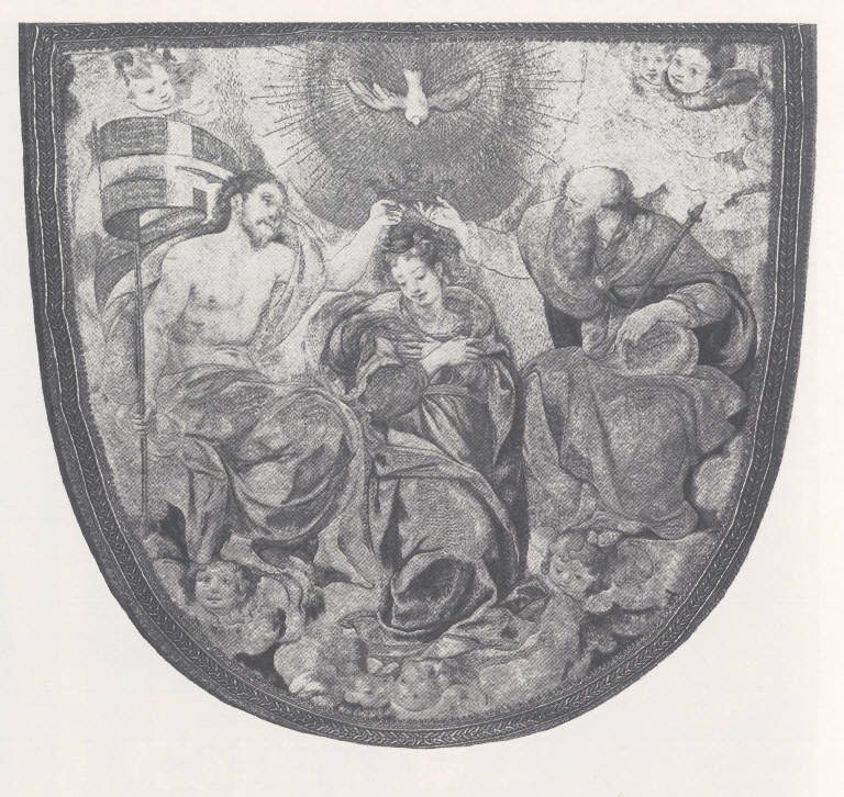 Ricamo rappresntante l'incoronazione della Vergine, affiancata a sinistra da cristo, a destra da Dio, a sovrastare la sena la colomba dello spirito santo.